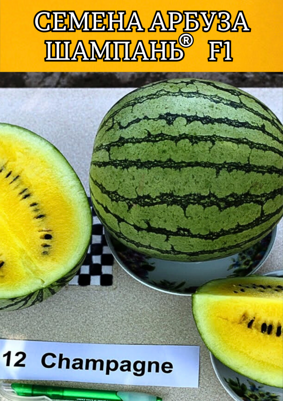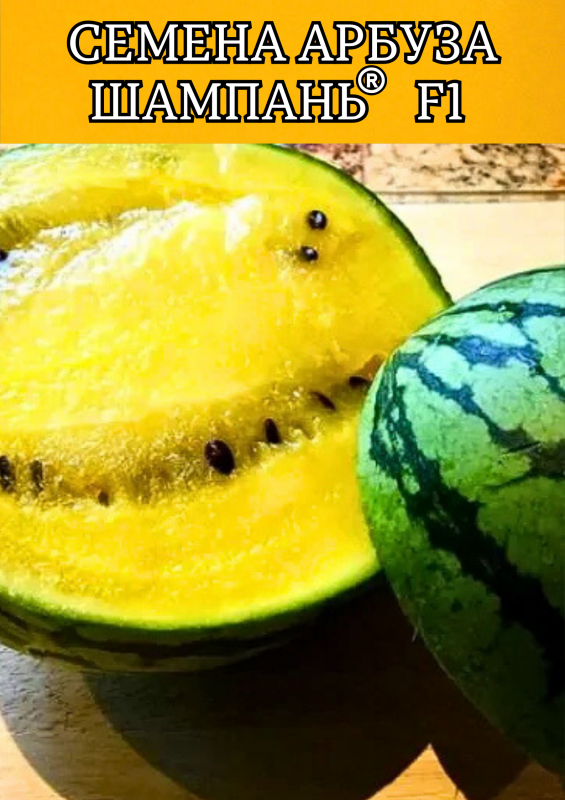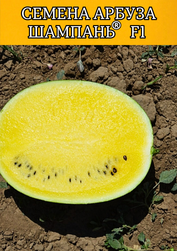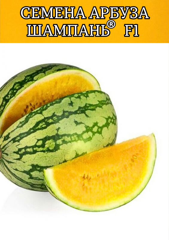 Шампань F1 — яркий и экзотический гибрид арбуза с жёлтой, сочной и сладкой мякотью. Вегетационный период составляет 73–80 дней от высадки рассады. Растение мощное, хорошо облиственное, с развитой корневой системой, что обеспечивает высокую завязываемость плодов — от 5 и более на растение. Плоды округлые, темно-зеленые со светло-зелеными полосами, средний вес — 2,5–3,5 кг, при использовании подвоя возможен рост до 8–9 кг.