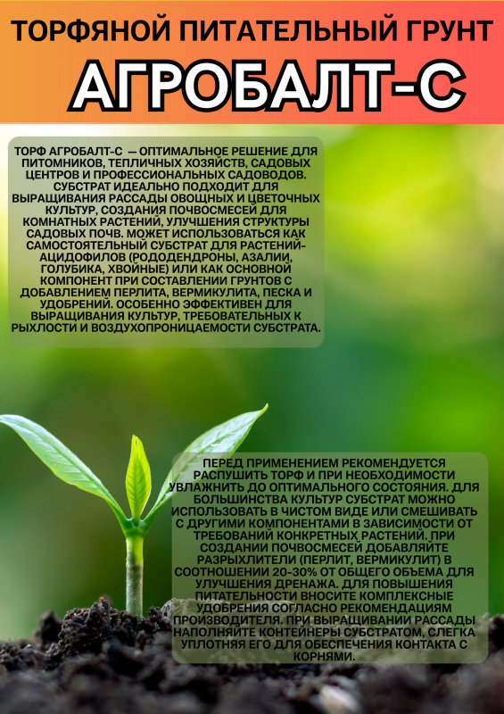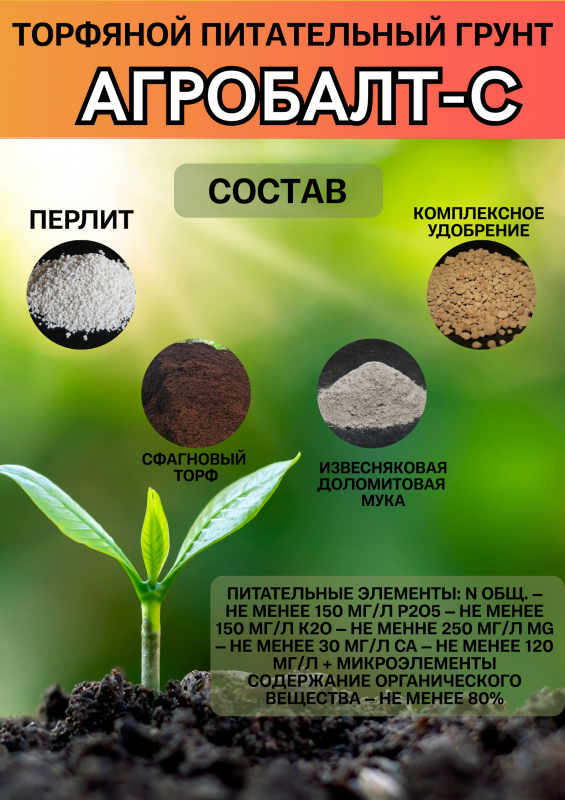 Торфяной питательный грунт Агробалт-С – это полностью готовый к использованию универсальный субстрат премиум-качества, созданный для успешного старта и здорового развития растений. На основе нейтрализованного верхового торфа он сочетает в себе идеальную воздушно-водную структуру и сбалансированный комплекс питания, что избавляет от необходимости дополнительных подкормок на начальном этапе роста.